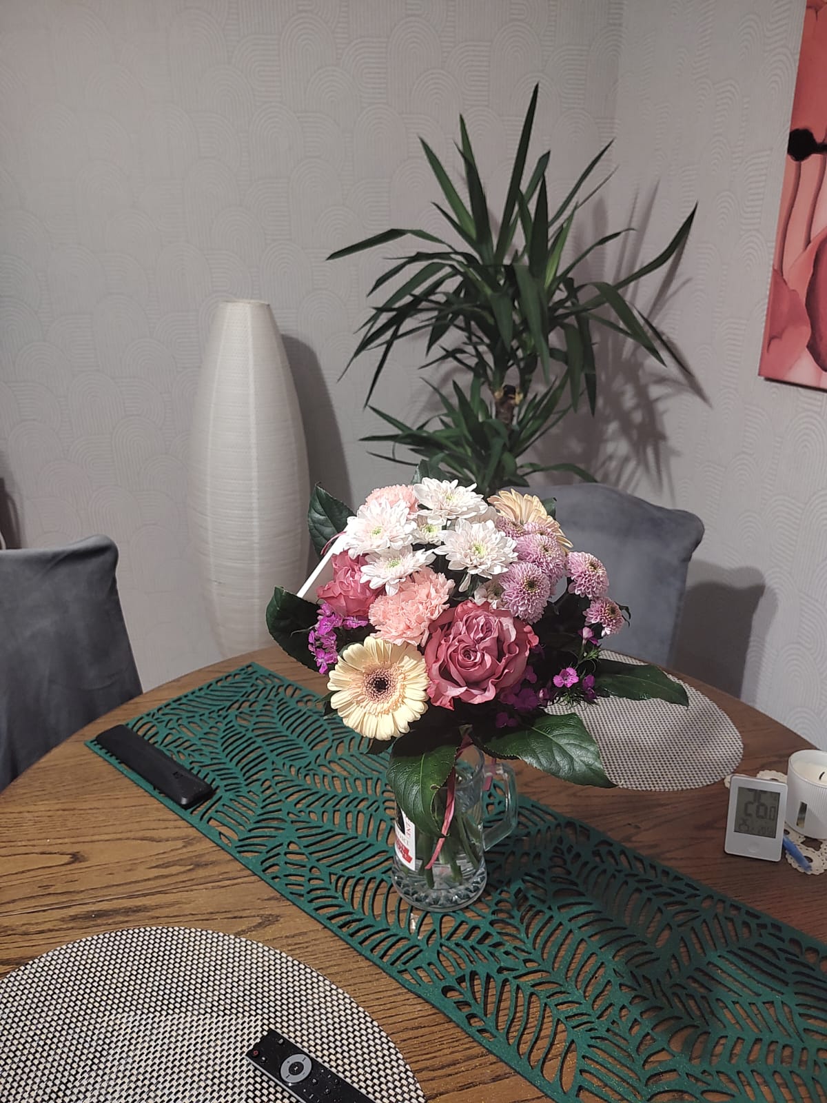 bilecik wypisany na kolanie - odręcznie, niestarannym pismem doręczono na czas kwiaty świeże, choć nie tak barwne jak na zdjęciu