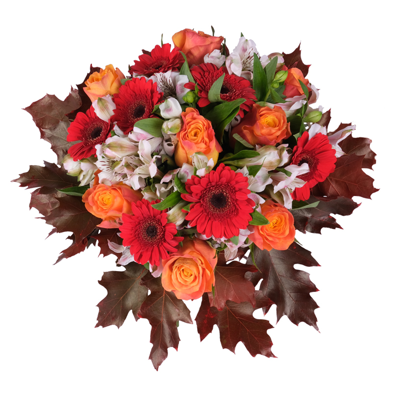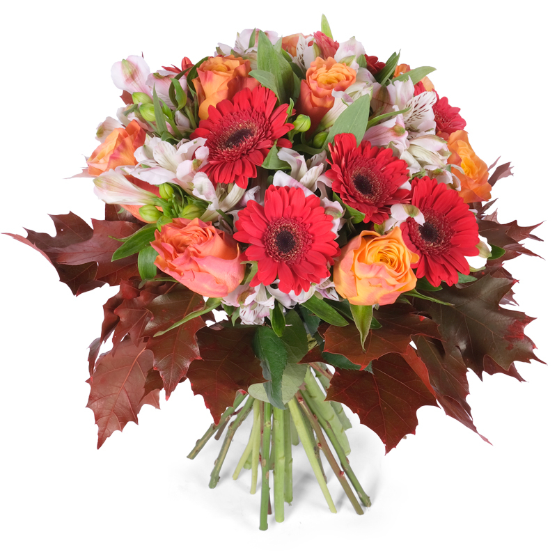 Bukiet z róż, gerber i alstromerii to ponadczasowy wybór. Liście w jesiennym klimacie dodają mu wyjątkowego, nieco rustykalnego charakteru. To propozycja pełna uroku i świeżości. Doskonały prezent dla osób, które cenią naturalne piękno. Zachwyci każdego swoim wdziękiem.